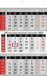 Tříměsíční kalendář roku 2026. Vyznačeny svátky okolních zemí. Posuvné okénko.Lze doobjednat závěsný panel s vlastním potiskem – formát panelu 30×20…