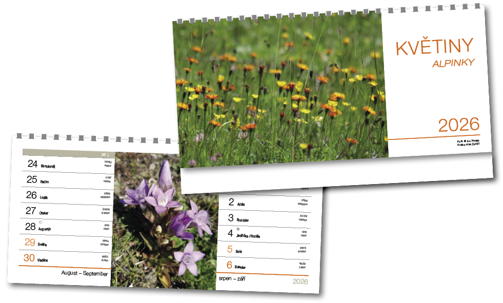 Stolní čtrnáctidenní kalendář s tématikou alpské květeny. Kartonový stojánek, spirálová vazba. Přehledný.